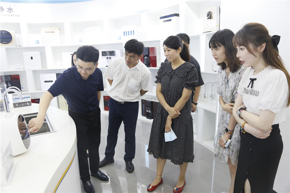 一行領(lǐng)導(dǎo)先后參觀了榮事達(dá)智能化生產(chǎn)車間和智慧水世界展廳,了解榮事達(dá)企業(yè)綜合實(shí)力及十大水處理產(chǎn)業(yè)具體發(fā)展?fàn)顩r,現(xiàn)場體驗(yàn)了企業(yè)最新研發(fā)定制產(chǎn)品與自主開發(fā)的物聯(lián)網(wǎng)校園智慧管理系統(tǒng),并為榮事達(dá)行業(yè)領(lǐng)先的技術(shù)實(shí)力點(diǎn)贊。