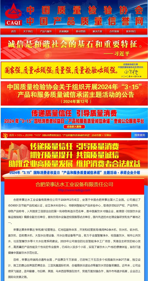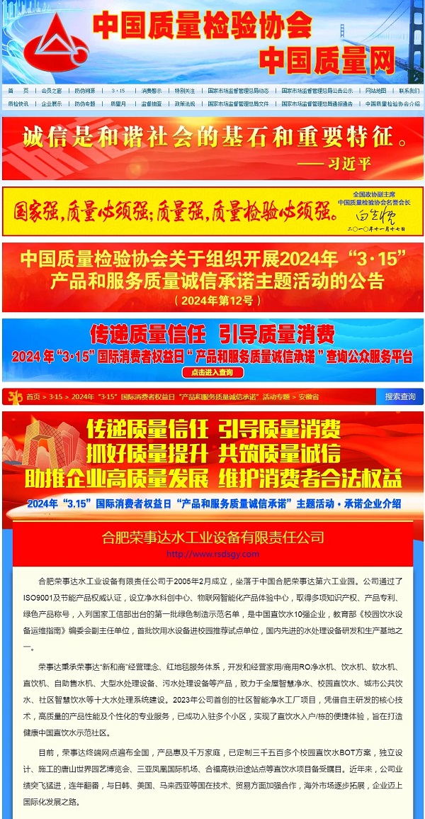 傳遞質(zhì)量信任,引導(dǎo)質(zhì)量消費(fèi)。 在由中國質(zhì)量檢驗(yàn)協(xié)會(huì)主辦的2024年“3·15”產(chǎn)品和服務(wù)質(zhì)量誠信承諾的主題活動(dòng)中,榮事達(dá)水工業(yè)公司憑借卓越的產(chǎn)品品質(zhì)及良好的社會(huì)形象,獲得協(xié)會(huì)以及權(quán)威專家的一致認(rèn)可,榮膺 “全國產(chǎn)品和服務(wù)質(zhì)量誠信示范企業(yè) ”“全國凈水行業(yè)質(zhì)量領(lǐng)先企業(yè)”“全國凈水行業(yè)質(zhì)量領(lǐng)先品牌”“全國產(chǎn)品和服務(wù)質(zhì)量誠信品牌”“全國質(zhì)量檢驗(yàn)穩(wěn)定合格產(chǎn)品”“全國質(zhì)量檢驗(yàn)信譽(yù)保障產(chǎn)品”“全國消費(fèi)者質(zhì)量信譽(yù)保障產(chǎn)品 ”多項(xiàng)榮譽(yù)。