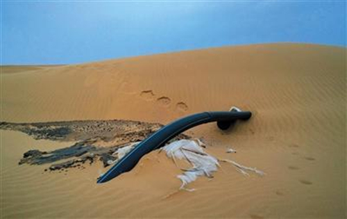 記者看到,每個排污池都有一個到數(shù)個白色“玻璃鋼夾砂”管道通向沙漠,方向指向工業(yè)園。在排污池和化工園區(qū)之間的一公里多都是沙漠,記者從排污池向化工園區(qū)方向行走,不時可以看見暴露在外面的排污管道,在一些洼地,還可以看到一些直接向下插入沙土里的黑色橡膠管道,這些管道周邊的細沙呈黑色。踢開表面,下面是黑色泥漿般的凝結(jié)物,發(fā)出一股惡臭味。