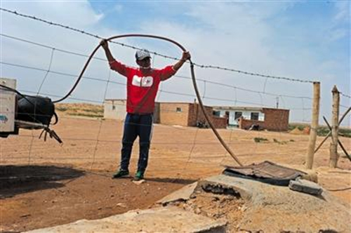 知情人告訴記者,在額里斯鎮(zhèn)沙漠腹地,有大約40多口挖掘深度大約在180米的取水井,均是供應(yīng)工業(yè)園區(qū)生產(chǎn)用水。記者在一處編號為31號的供水井看到,水井的蓋子上寫著“慶華精細化工工業(yè)園供水”,知情人指著遠處一排排伸向沙漠腹地的電線桿說,每個線路的盡頭,都是這樣的水井,逐年增多,井也越挖越深。