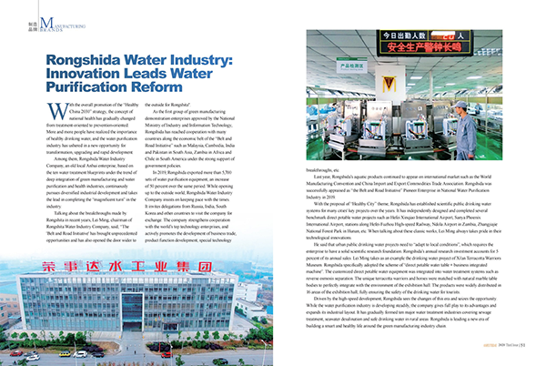 伴隨著“健康城市”主題全面倡導(dǎo),榮事達(dá)多年來為多個(gè)城市重點(diǎn)項(xiàng)目建立起科學(xué)的公共飲水系統(tǒng),獨(dú)立設(shè)計(jì)、完成合肥新橋國際機(jī)場(chǎng)、三亞鳳凰國際機(jī)場(chǎng)、合福高鐵沿線站點(diǎn)、贊比亞恩多拉機(jī)場(chǎng)、湖南張家界國家森林公園等多個(gè)標(biāo)桿性直飲水工程方案。每每談到這些 經(jīng)典作品時(shí),雷鳴都會(huì)對(duì)其中的技術(shù)創(chuàng)新點(diǎn)引以為傲。 他介紹,城市公共飲水工程需要做到“因地制宜 專案定制”,這要求企業(yè)必須擁有堅(jiān)實(shí)的科研基礎(chǔ)。而榮事達(dá)作為國內(nèi)先進(jìn)的水處理設(shè)備研發(fā)生產(chǎn)基地,每年將5%銷售額投入科研中,不斷打造凈水科創(chuàng)中心、物聯(lián)網(wǎng)智能化產(chǎn)品體驗(yàn)中心等機(jī)構(gòu),可以靈活應(yīng)對(duì)每一項(xiàng)工程。就如西安兵馬俑博物館飲水工程中,榮事達(dá)針對(duì)性采用“直飲水臺(tái)+商務(wù)一體機(jī)”方案,定制的直飲水設(shè)備融入反滲透分離等水處理系統(tǒng),以獨(dú)特兵馬俑造型搭配天然大理石臺(tái)體,與會(huì)館環(huán)境完美融合,產(chǎn)品廣泛分布于會(huì)館內(nèi)16個(gè)區(qū)域,充分保障游客飲水安全。 新時(shí)期產(chǎn)業(yè)發(fā)展戰(zhàn)略及其折射的諸多變化,指引的正是以“創(chuàng)新化”、“多元化”為核心的企業(yè)轉(zhuǎn)型方向。身處高速發(fā)展引擎下的榮事達(dá),看到這個(gè)時(shí)代的變化并抓住機(jī)遇,在凈水產(chǎn)業(yè)穩(wěn)健發(fā)展的同時(shí),充分發(fā)揮優(yōu)勢(shì)拓展產(chǎn)業(yè)布局,逐步形成了覆蓋污水處理、海水淡化、農(nóng)村安全飲水在內(nèi)的十大水處理產(chǎn)業(yè),其中海水淡化項(xiàng)目已申報(bào)國家中央預(yù)算內(nèi)投資項(xiàng)目。圍繞綠色制造產(chǎn)業(yè)鏈締造智慧健康生活,榮事達(dá)正在引領(lǐng)著屬于它的新時(shí)代。