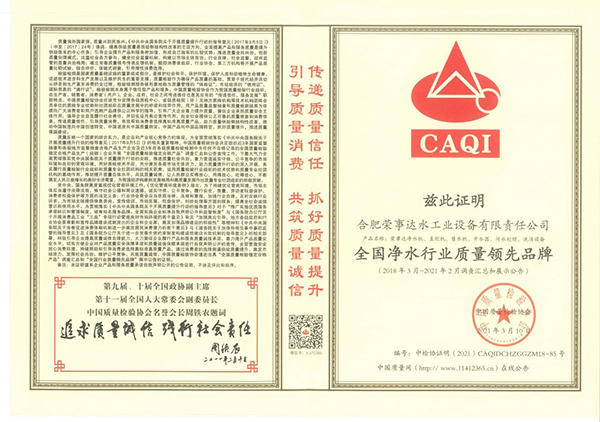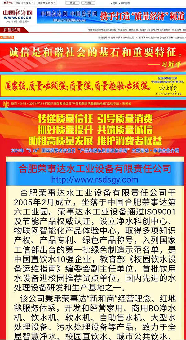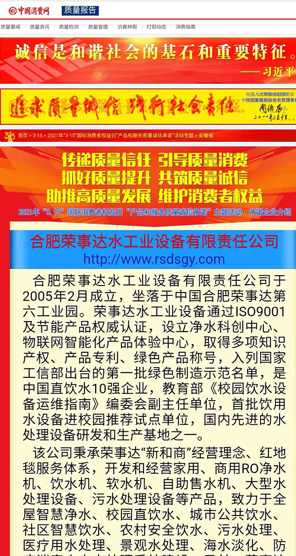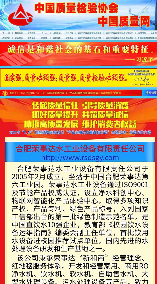 共筑質量誠信,引導質量消費。在由中國質量檢驗協會主辦的2021年“3.15”產品和服務質量誠信承諾的主題活動中,榮事達憑借卓越的產品品質及良好的社會形象,獲得協會以及權威專家的一致認可,榮膺 “全國產品和服務質量誠信示范企業(yè)”“全國質量信得過產品”“全國凈水行業(yè)質量領先品牌” “全國質量誠信先進企業(yè)”多項榮譽,《中國質量報》、《中國消費者報》及中國質量網、中國經濟網、中國消費網等多家媒體均予以集中展示和公告。