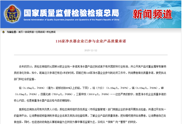 質(zhì)檢總局|116家凈水器企業(yè)參與企業(yè)產(chǎn)品質(zhì)量承諾 榮事達位列前茅
