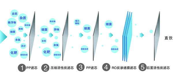 原水通過水管進(jìn)入RO凈水機(jī)的前三級(jí)濾芯進(jìn)行初濾,然后在由增壓泵對(duì)水施壓,讓水流RO反滲透膜中,通過RO膜的逆滲透效果精細(xì)凈化水源,然后在將水輸送到壓力桶,由壓力桶保存;當(dāng)需要使用時(shí)在打開壓力桶球閥,通過壓力桶施壓讓水流入最后一級(jí)T33濾芯(活性炭濾芯,主要為凈化水質(zhì)口感),在通過鵝頸水龍頭產(chǎn)水詳情可參考凈水機(jī)原理。